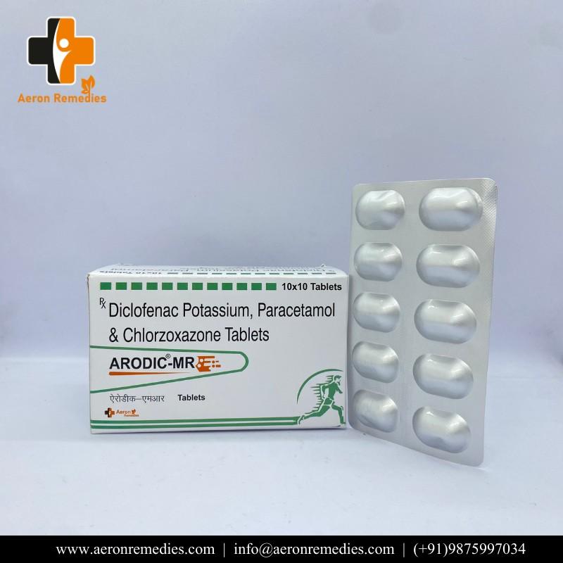 ARODIC MR is a combination of Diclofenac, Chlorzoxazone, and Paracetamol for painful musculoskeletal conditions. Diclofenac and Paracetamol relieve pain and inflammation, while Chlorzoxazone acts as a muscle relaxant. It is commonly prescribed in muscle spasms, sprains, and back pain. The formulation helps reduce stiffness and improve mobility. Provides effective relief when taken as directed.