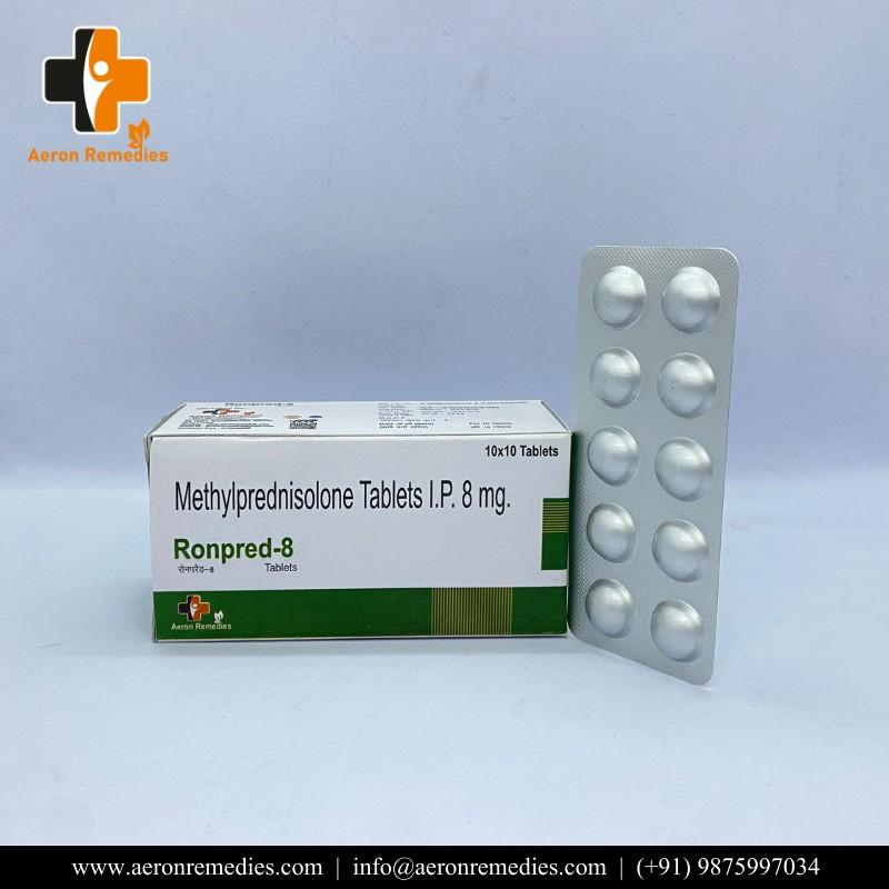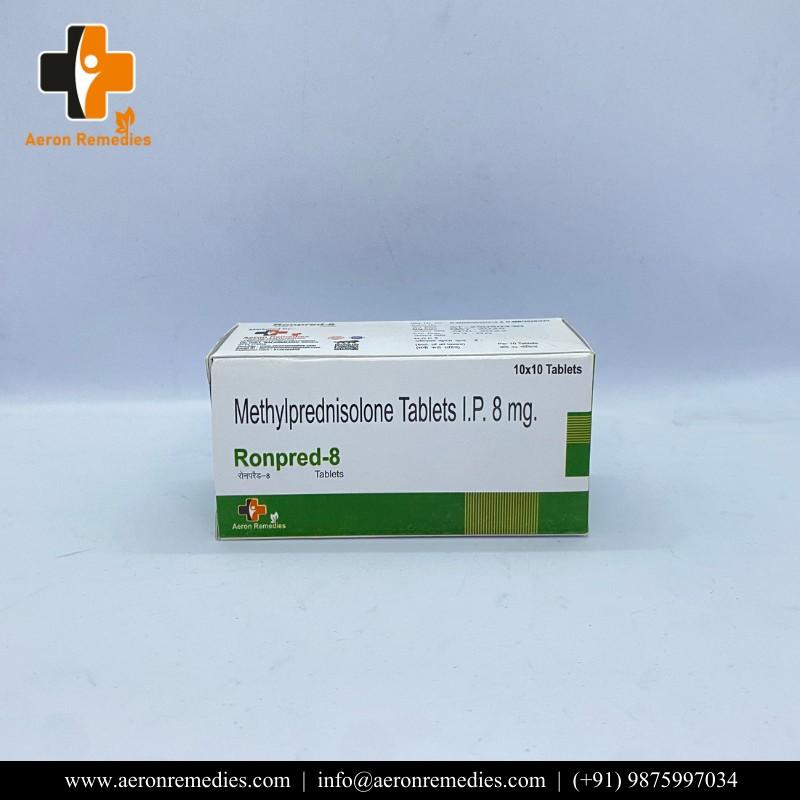 RONPRED-8 contains Methylprednisolone 8 mg for moderate to severe inflammatory conditions. It provides stronger anti-inflammatory and immunosuppressive action. Commonly used in severe allergies and autoimmune disorders. The formulation ensures effective therapeutic response. To be used as directed by a physician.
